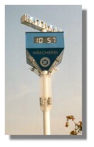 15 Meter hoher Werbeturm mit eingebauter Uhr und Temperaturmessung. Drehbare Einzelbuchstabenanlage